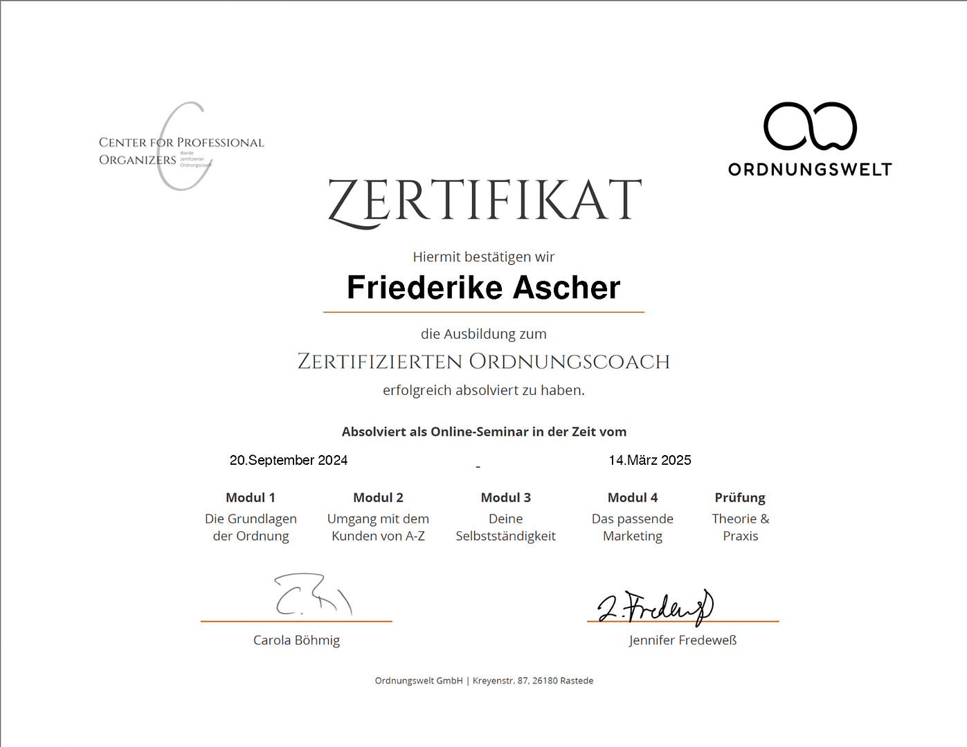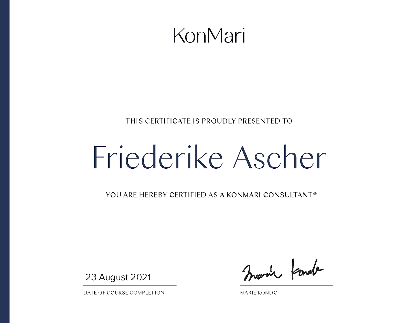 Damals hätte ich mir die Unterstützung durch eine:n Ordnungscoach:in gewünscht, um schneller und gezielter voranzukommen. Heute biete ich genau diese Begleitung an und unterstütze Menschen auf ihrem Weg zu einem leichteren Alltag und einem wohnlichen Zuhause, das ihnen guttut. Ich ließ mich zur zertifizierten KonMari®-Consultant ausbilden und zur TÜV-geprüften Ordnungsexpertin. Mein Wissen habe ich durch Ausbildungen in Innenarchitektur und Raumgestaltung sowie zur zertifizierten Feng-Shui-Beraterin ergänzt – und darin meine berufliche Erfüllung gefunden.